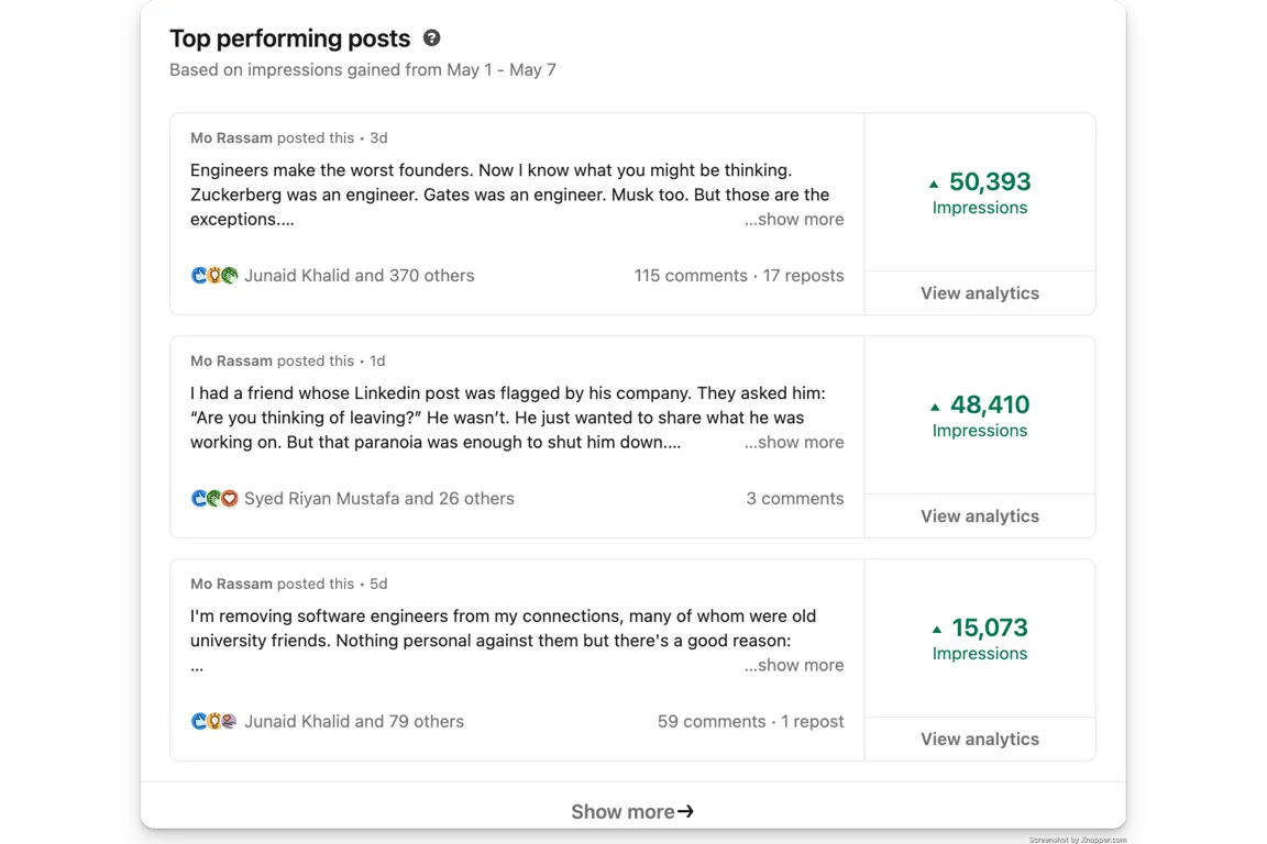 "Analyze the engagement patterns in my recent LinkedIn posts"
