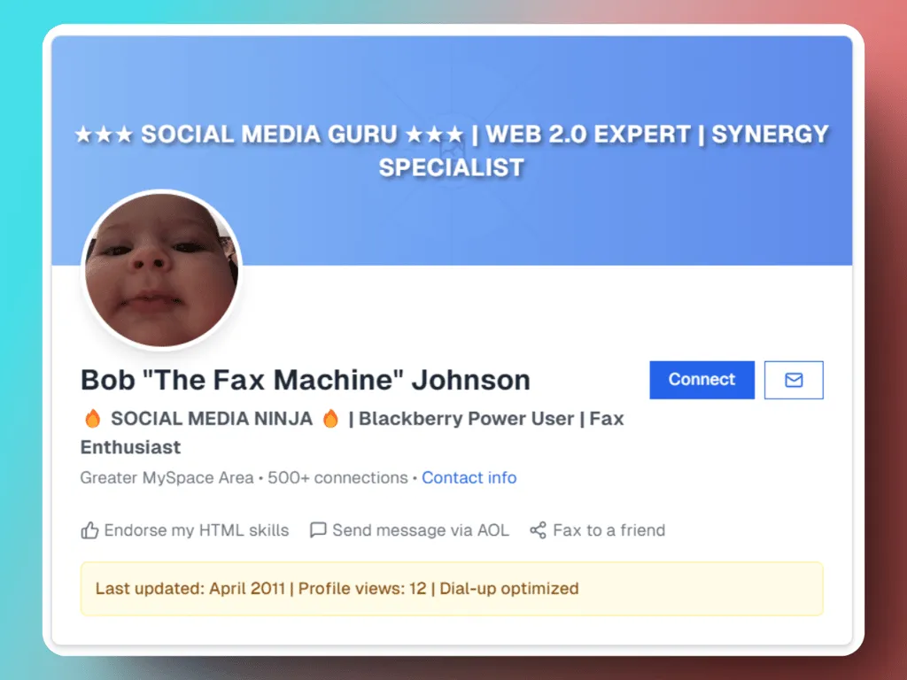 Your profile pic from 2004 when you were probably a baby, I guess. That banner image that's slightly pixelated. And oh god, that bio that reads like it was written by a committee of corporate robots.