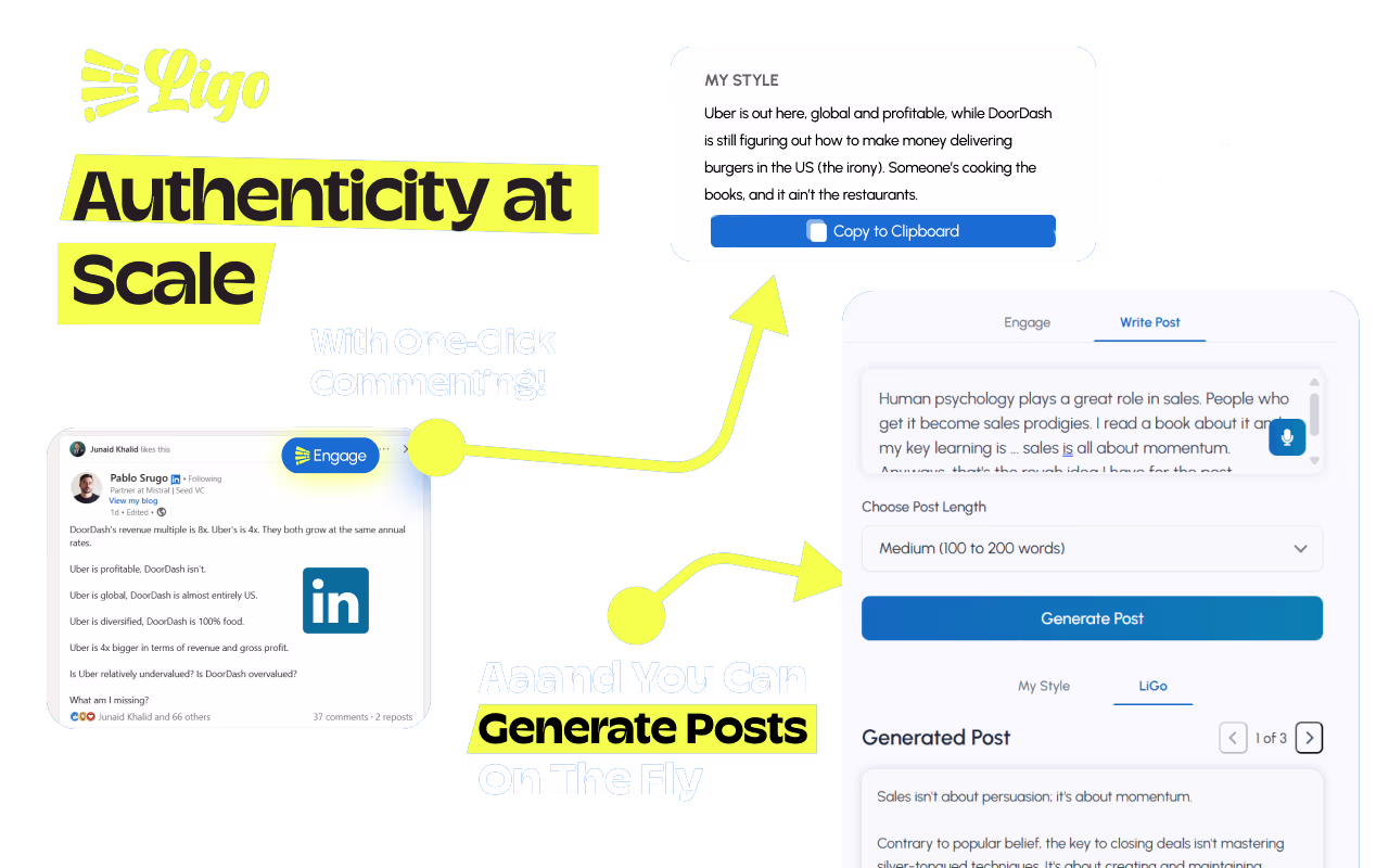 Generate LinkedIn comments 90% faster with LiGo's Chrome Extension - designed to keep you compliant with LinkedIn's Terms of Service
